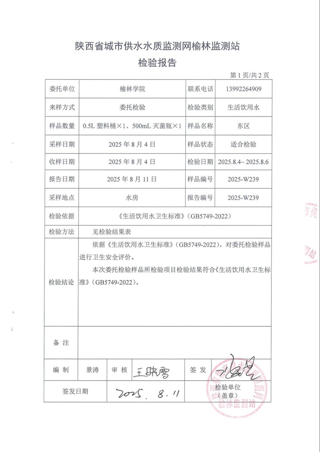 1、东区水质化验报告